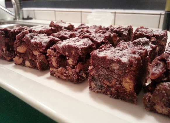 Maar wat is het dan? Tiffin bestaat uit een mengsel van chocolade, noten, sultanas-geweekt-in-sinaasappelsap en brokjes digestive koekjes (very British).