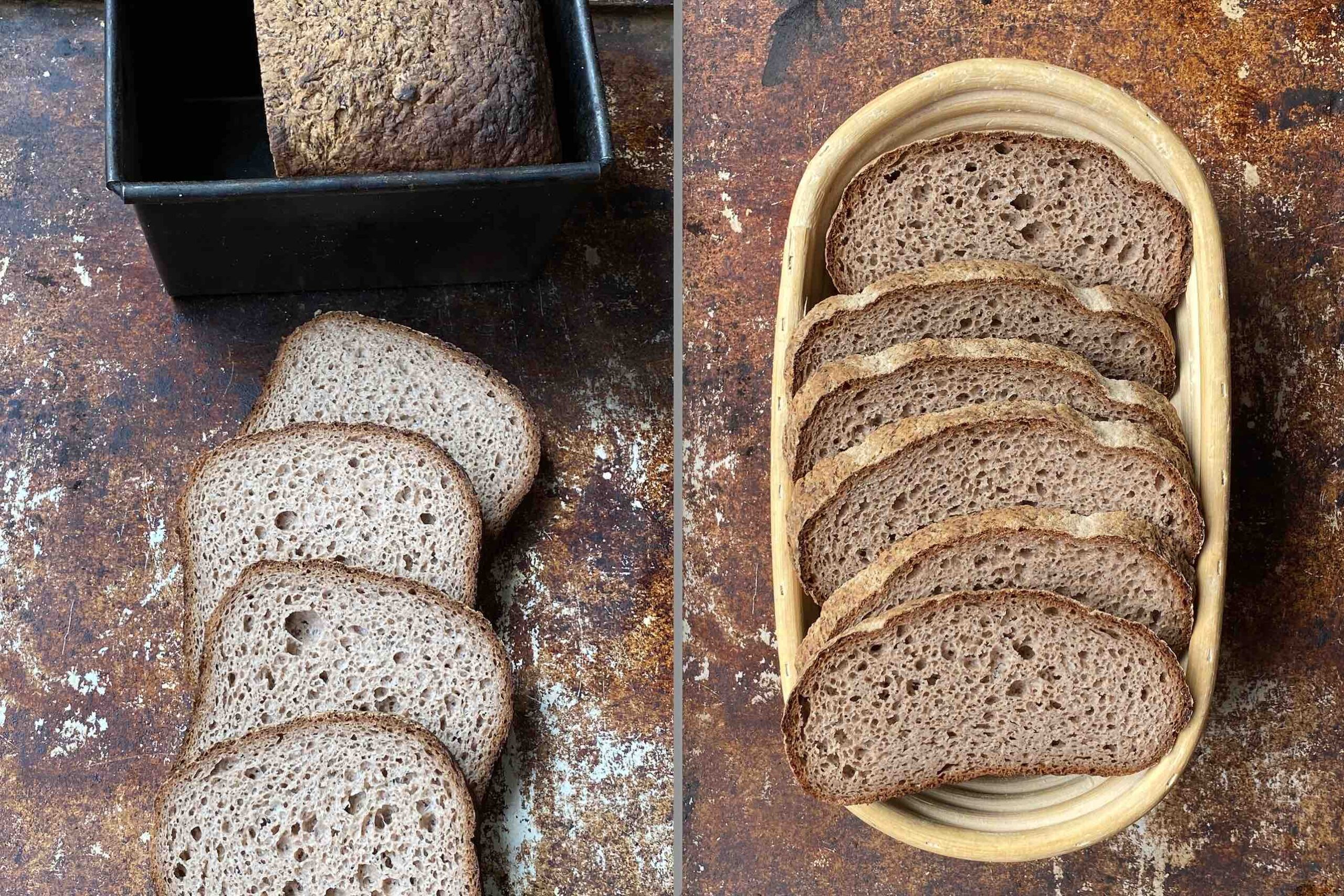 Dus deze week heb je de keuze uit twee vormen: een busvorm (om een vierkant bammetje van te snijden) of een langwerpige vorm, zoals ons rogge zuurdesembrood.