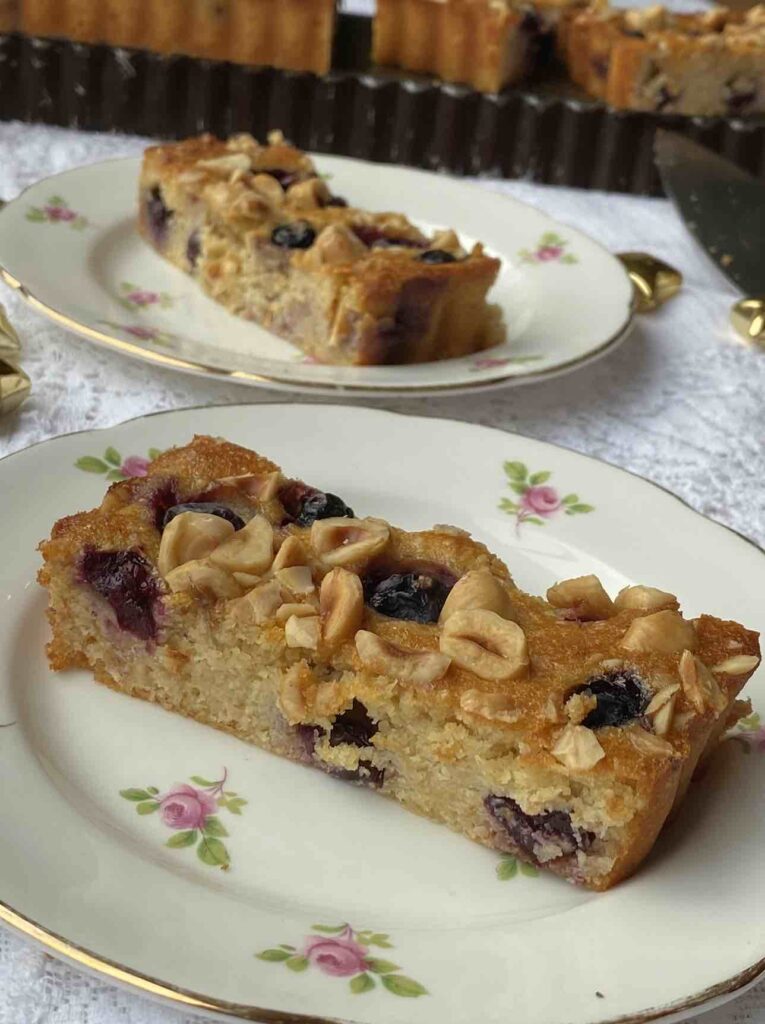 Sappige bosbessen in een beslag van gemalen hazelnoten, ricotta, een beetje citroenrasp en een vleugje gember. Afgetopt met nog meer bosbessen en grof gehakte hazelnoten. Yammie!