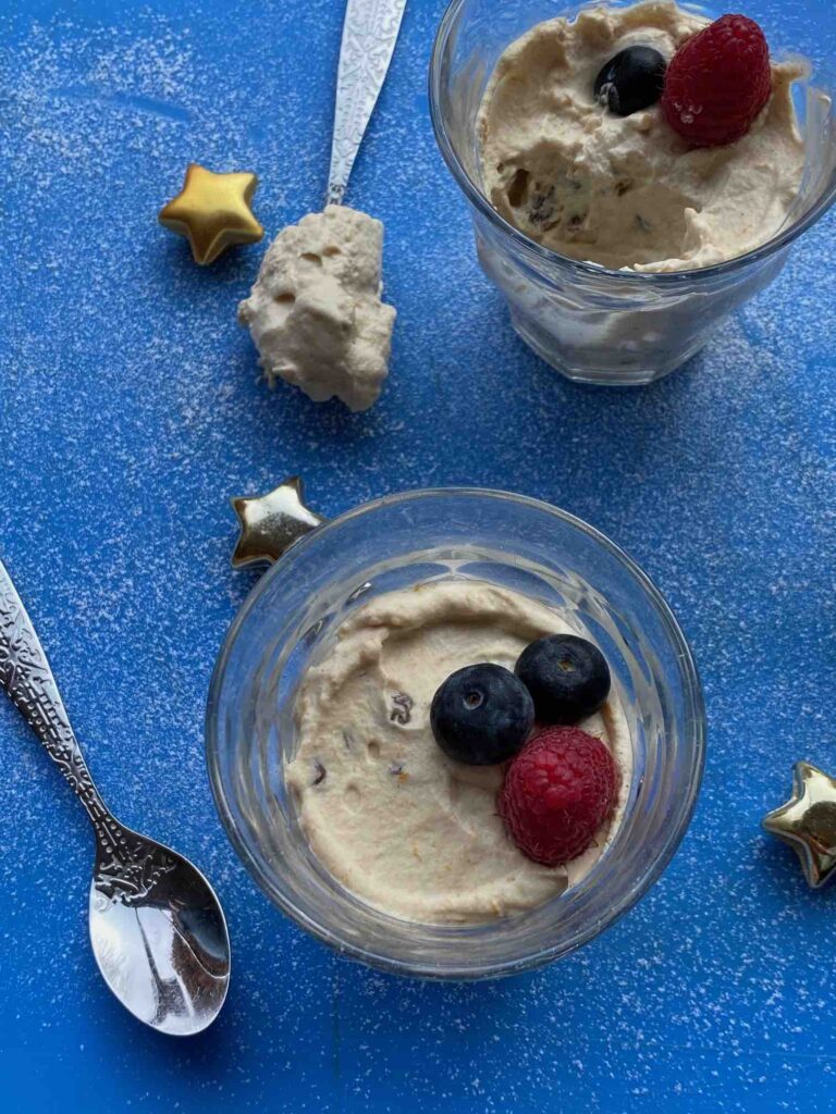 Dat was een uitnodiging die Jayne niet kon weerstaan…dus begon ze aan Aunty Jeans recept te sleutelen (sorry Aunty Jean). Veel minder alcohol: een paar eetlepels sherry en cognac in plaats van honderden milliliters. En om een meer uitbundige feestelijke smaak te geven aan de mousse voegde ze citroen, sinaassapel, kaneel en gemberpoeder toe. Plus sultana’s (eerst geweekt in die paar eetlepels sherry en cognac).