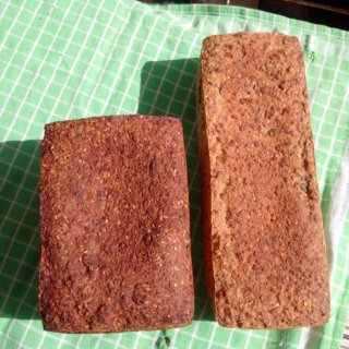 We kunnen nooit beslissen welk formaat we het beste vinden: de langwerpige (24 cm) ‘Brick’ die lang en dun is (rechts op de foto), of onze ‘normale’ busbroodbakvormen waarin we onze busbroden bakken (links op de foto). Deze laatste geeft het idee van een ‘echt’ sneetje brood, het bammetje. Wij kunnen niet kiezen, dus we laten deze week de keuze over aan jullie zelf ! De foto’s geven een indruk van de verschillen. Even herinneren om je keuze te melden bij je bestelling svp.