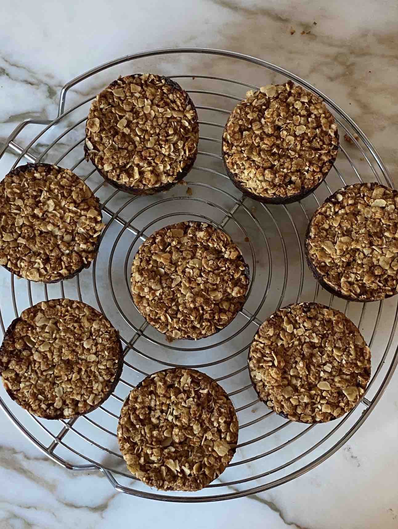 Elk rondje is 6 cm in doorsnede en 2,5cm hoog. Je kunt ze zowel bij een kopje koffie of thee serveren. Jayne heeft ontdekt dat ze perfekt zijn voor een brunch of weekend ontbijt, bijvoorbeeld met plakjes banaan en ricotta of dikke Griekse yoghurt. Je kunt ze ook licht opgewarmd serveren als dessert met roomijs, fruitsalade of slagroom…ideeën genoeg…