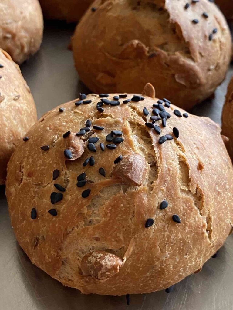 Dit brood combineert die über-Hollandse ingrediënt, pindakaas, met wat pittige chili vlokjes. Niet te veel chili trouwens – denk aan een kietel in plaats van een knal. Naast de pindakaas en de chili vlokjes voegen we voor de crunch een handvol geroosterde pinda’s toe en tenslotte komijnzaden voor de extra onverwachte (na)smaak-punch.