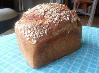 Een licht volkorenbrood dat vol zit met verschillende verse lentekruiden zoals bieslook, peterselie en misschien ook dille. Bovenop zitten havervlokken om het een interessant contrast te geven – als ze tenminste niet wegwaaien in onze heteluchtovens – net zoals een foute toupet tijdens een waaierige strandwandeling….