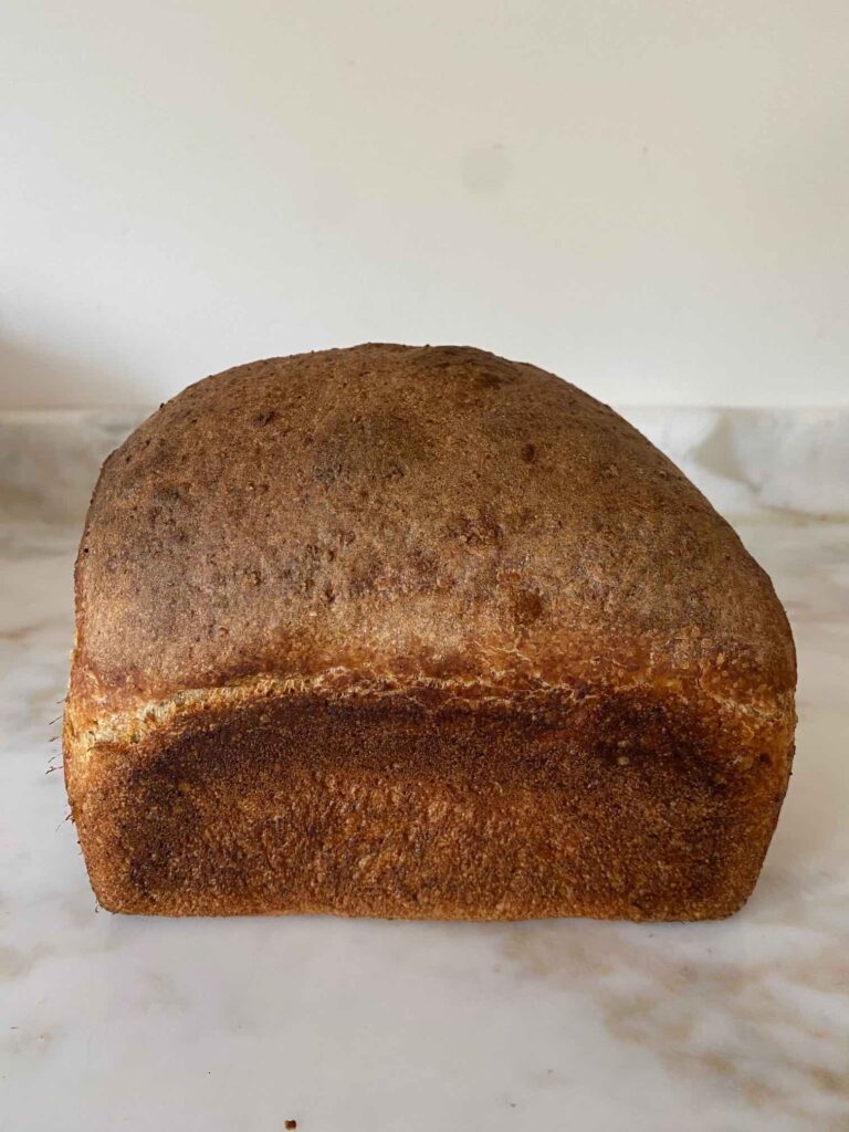 Voor dit brood gebruiken we een andere starter dan in ons rogge zuurdesembrood. En dat proef je ook – er is een mildere smaak in vergelijking tot de ietwat zurige smaak van ons signature rogge zuurdesem. Daarna is het een volkoren ‘bruin’ zuurdesembrood gemaakt van 50% volkoren tarwemeel en 50% gewoon tarwemeel. Lekker voedzaam en vertrouwd. En zonder toevoegers van ‘iets’ hè! We maken dit in onze busbroodvormen wat leidt tot een rechthoekig brood. We horen je al juichen: rechthoekige bammetjes voor de picknick én voor in de lunchtrommel. Hoera!