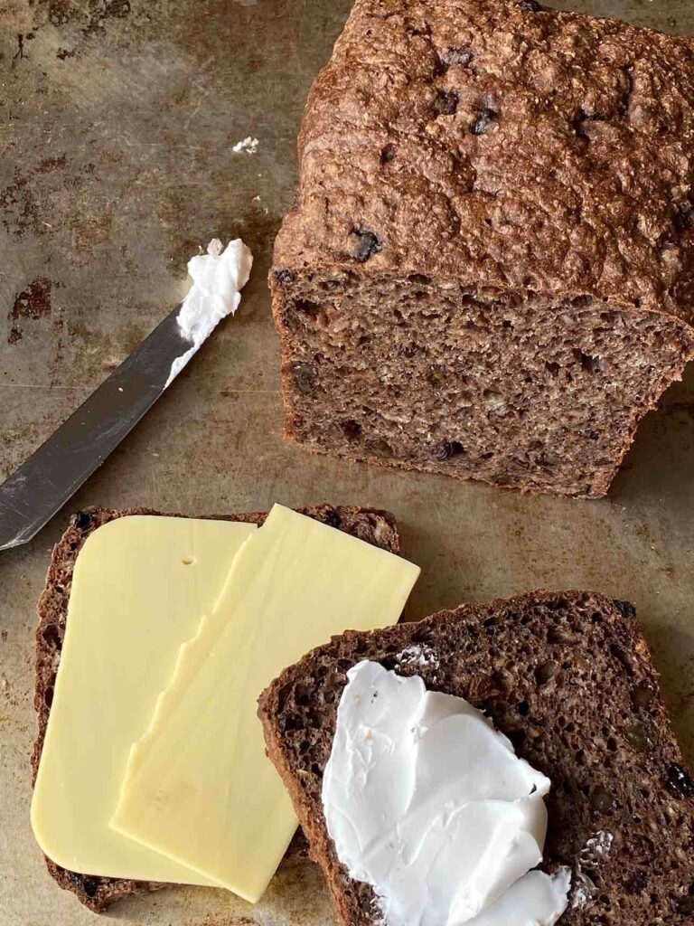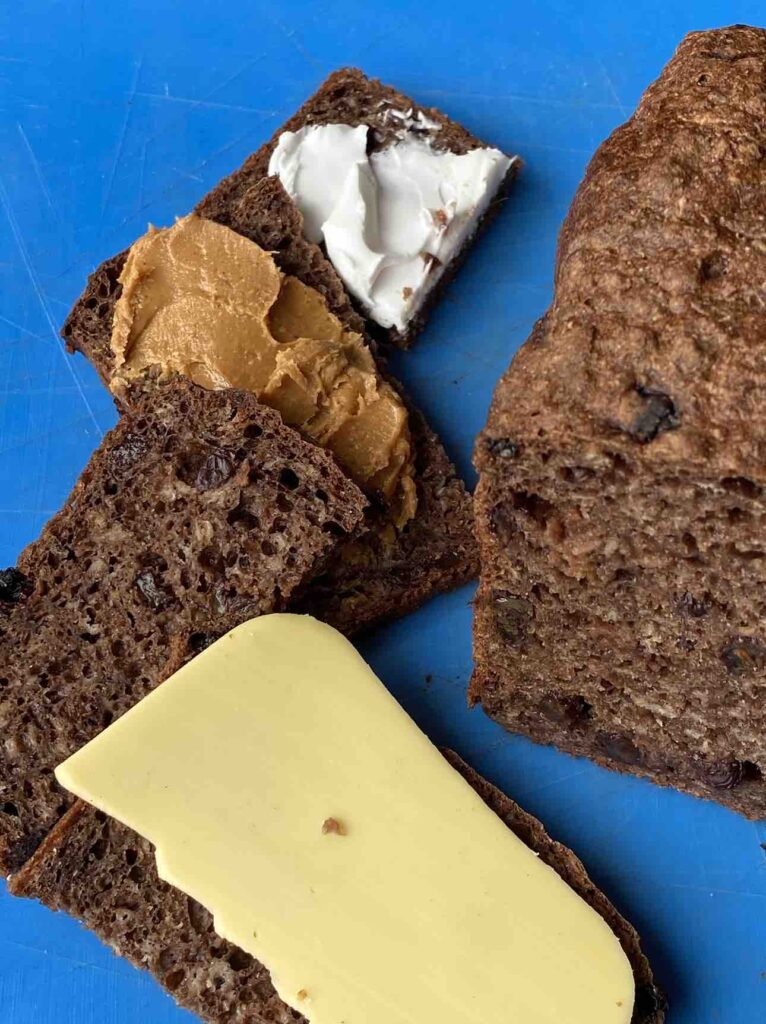 In de foto hierboven zie je de verschillende combinaties die we hebben uitgeprobeerd: kaas (die zout-zoete combi is zeker aan aanrader), pindakaas, roomkaas (dat zachte witte geeft een mooi kleurcontrast met het donkere brood), maar bizar genoeg is goede gerookte zalm ook lekker, evenals een hardgekookt- of gebakken eitje (no pictures).