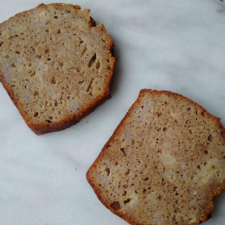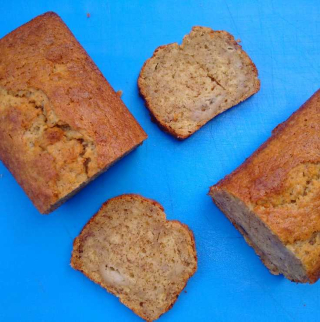 We gebruiken boekweitmeel, amandelmeel, veel rijpe bananen, een beetje honing, een vleugje kaneel en wat eieren (om het beslag goed te binden). Het resultaat is een malse, sappige cake die lekker voedt en ook voldoening geeft. Ja, ja, en deze cake bevat ook nog eens geen gluten, suiker of lactose.